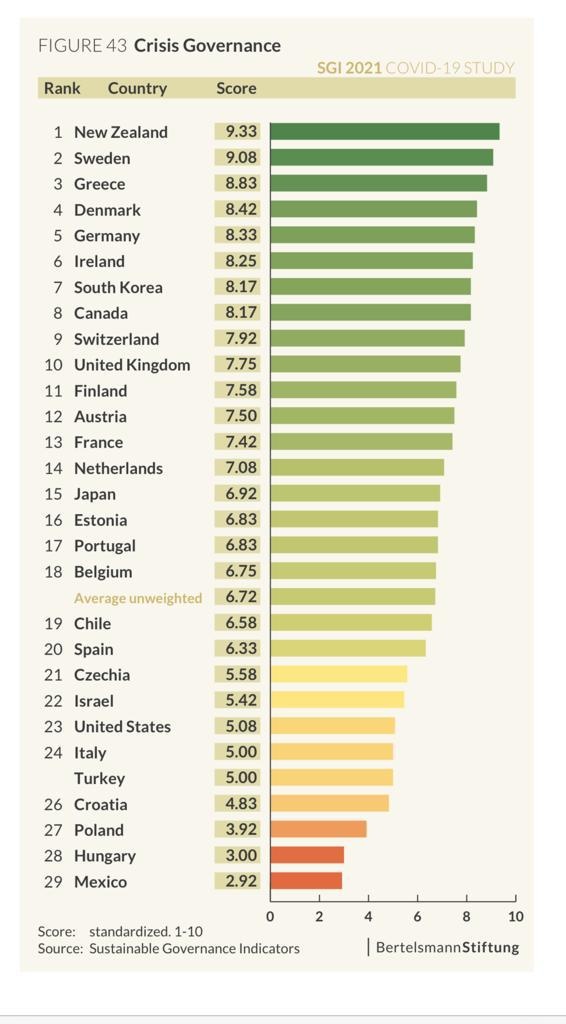 Συγκεκριμένα, στην κατηγορία «Ανθεκτικότητα της διακυβέρνησης», η Ελλάδα κατατάσσεται ένατη ανάμεσα σε 29 κράτη, με βαθμολογία 7,56 στα 10, πίσω από τη Νέα Ζηλανδία, τη Νότια Κορέα, τη Σουηδία, τη Δανία, τη Γερμανία, την Ιρλανδία, τον Καναδά και την Ελβετία. Πιο κάτω από την Ελλάδα κατατάσσονται η Φιλανδία, η Αυστρία, η Ιαπωνία, η Ολλανδία και η Πορτογαλία, ενώ κάτω από τον μέσο όρο βρίσκονται μεταξύ άλλων η Εσθονία, η Χιλή, η Γαλλία, η Ισπανία, το Βέλγιο, η Τουρκία , η Τσεχία και οι ΗΠΑ και στις τελευταίες θέσεις βρίσκονται το Μεξικό, η Ουγγαρία και η Πολωνία.