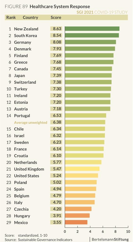 Στην κατηγορία «Ανθεκτικότητα Κράτους Πρόνοιας», η Ελλάδα βρίσκεται στη δέκατη θέση, με βαθμολογία 6,38 στα 10, καθώς, όπως αναφέρεται, «το σύστημα Υγείας ήταν υποχρηματοδοτούμενο και απροετοίμαστο πριν από την κρίση, αλλά η κυβέρνηση πέτυχε να διπλασιάσει τον αριθμό των κλινών ΜΕΘ».