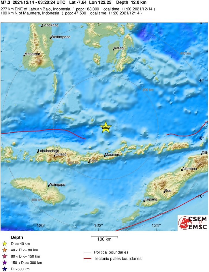Το αμερικανικό ινστιτούτο γεωλογικών μελετών (USGS), από την πλευρά του, έκανε λόγο για σεισμό 7,3 βαθμών σε εστιακό βάθος 18,5 χιλιομέτρων σε θαλάσσια περιοχή κοντά στο νησί Φλόρες, περίπου 100 χιλιόμετρα από την πόλη Μομέρε.