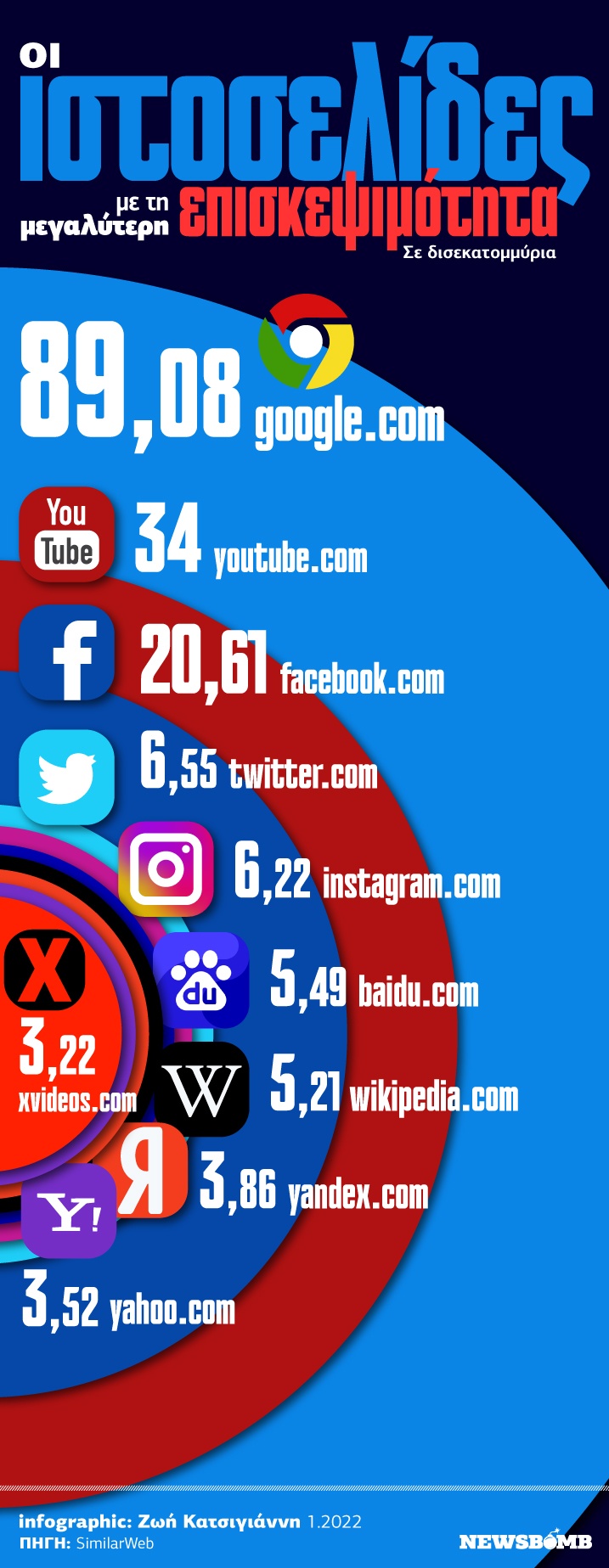 Βρίσκεται λοιπόν στην πρώτη θέση, αλλά καθώς η λίστα προχωράει απο τα επίσης «αναμενόμενα» YouTube και Facebook, ορισμένοι από τους ιστότοπους μπορεί να αποτελούν έκπληξη ή να είναι εντελώς άγνωστοι για το ευρύ κοινό.