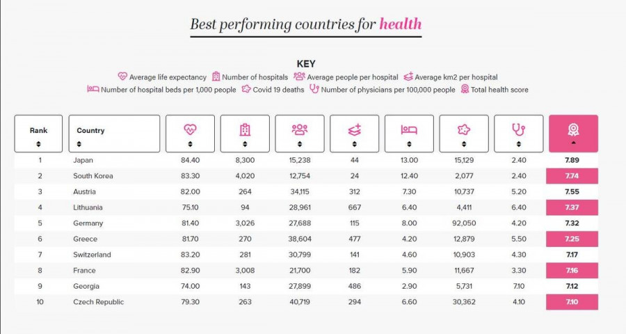 Στην κατάταξη για την πρώτη δεκάδα ακολουθούν Γαλλία, Τσεχία, Πορτογαλία και Κίνα. Η Ιαπωνία βρίσκεται στην κορυφή της λίστας με το υψηλότερο προσδόκιμο επιβίωσης στον κόσμο, καθώς οι Ιάπωνες ζουν κατά μέσο όρο 84,4 έτη, με τον παγκόσμιο μέσο όρο να είναι στα 78,14 έτη.
