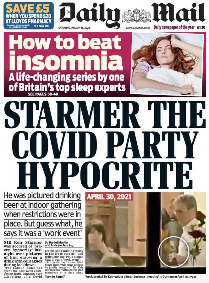 Οι καταγγελίες για τα κορονοπάρτι όμως παίρνουν διαστάσεις χιονοστιβάδας. Ο ηγέτης των Εργατικώνβρέθηκε επίσης στο στόχαστρο, κατηγορούμενος ότι και εκείνος με τη σειρά του παραβίασε τους κανόνες του lockdown. Το πρωτοσέλιδο της Daily Mail το Σαββατοκύριακο τον δείχνει να πίνει και να τρώει με άλλους σε ένα κτήριο κατά τη διάρκεια των αυστηρών lockdown τον Απρίλιο του 2021.