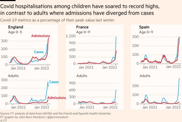 Οι εισαγωγές σε παιδιατρικά νοσοκομεία στη Γαλλία είναι σχεδόν έξι φορές περισσότερες από το προηγούμενο υψηλό του Αυγούστου 2021, ενώ τα ποσοστά κρουσμάτων στην Αγγλία στις ηλικίες κάτω των 5 ετών είναι πάνω από τρεις φορές υψηλότερα από την κορύφωση του περασμένου χειμώνα. Περίπου 80 παιδιά κάτω των 5 ετών εισάγονται καθημερινά σε νοσοκομείο στην Αγγλία, σε σχέση με το προηγούμενο ρεκόρ των 24 το περασμένο καλοκαίρι. Το ποσοστό νοσηλείας κάτω των 5 ετών στις ΗΠΑ έχει εκτιναχθεί σε πάνω από τέσσερα ανά 100.000 εισαγωγές, από 2,5 ανά 100.000 τον Δεκέμβριο, και είναι μακράν το υψηλότερο ποσοστό κατά τη διάρκεια της πανδημίας.