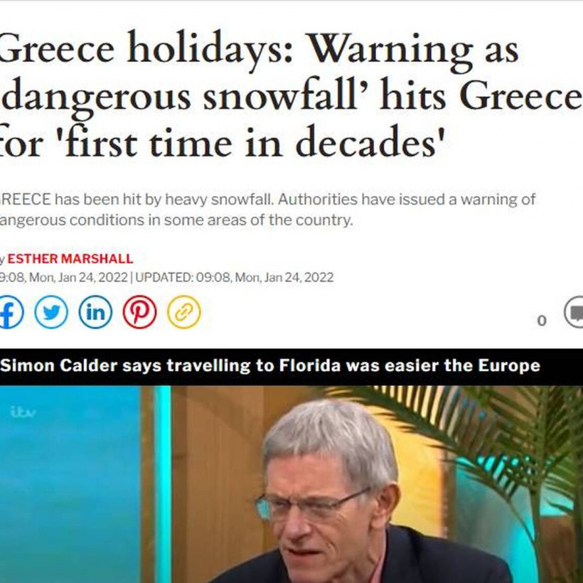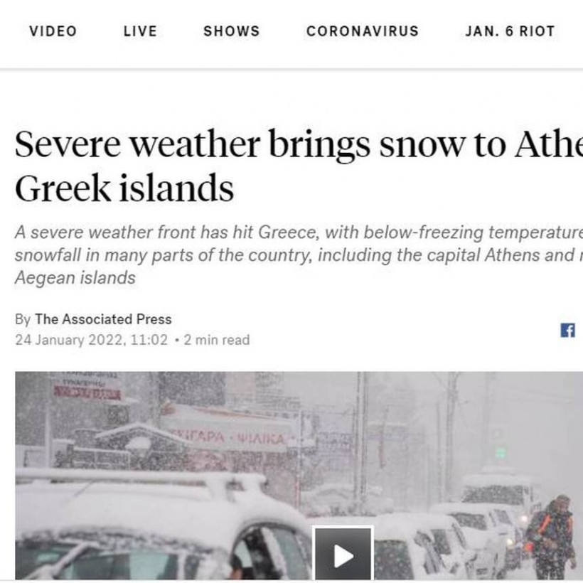 ΑΒC: «Έντονο καιρικό μέτωπο έχει πλήξει την Ελλάδα, με τις θερμοκρασίες να πέφτουν υπό του μηδενός και χιονοπτώσεις σε πολλές περιοχές της χώρας, συμπεριλαμβανομένης της πρωτεύουσας Αθήνας και πολλών νησιών του Αιγαίου. Οι αρχές έχουν προειδοποιήσει τους κατοίκους να περιορίσουν τις μετακινήσεις τους σε εξωτερικούς χώρους στις απαραίτητες τη Δευτέρα και την Τρίτη, ενώ τα σχολεία έκαναν μόνο διαδικτυακά μαθήματα»