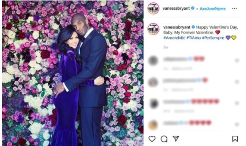«Χαρούμενο Βαλεντίνο μωρό μου. Για πάντα ο Βαλεντίνος μου», έγραψε στη λεζάντα της φωτογραφίας. Τον Ιανουάριο του 2020, ο θρύλος του NBA, Κόμπι Μπράιαντ «έφυγε» από τη ζωή έπειτα από την συντριβή ελικοπτέρου στην Καλιφόρνια. Τραγικό θάνατο βρήκε και η 13χρονη κόρη του ζευγαριού, Τζιάννα, που επέβαινε σε αυτό μαζί με τον πατέρα της.