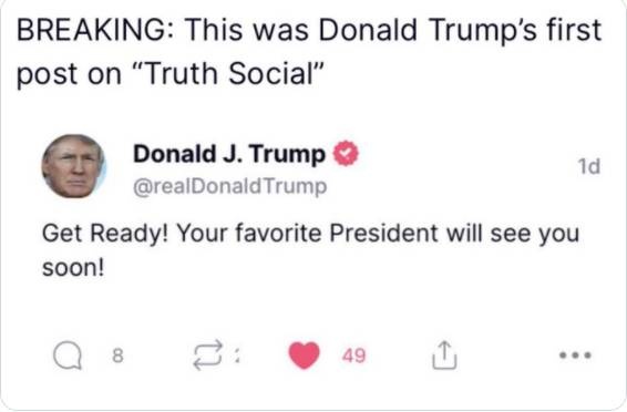 Ο μεγαλύτερος γιος του Τραμπ, Ντόναλντ Τζούνιορ, ανέβασε στο Twitter ένα στιγμιότυπο από την πρώτη ανάρτηση του πατέρα του στο Truth Social, το οποίο έλεγε: «Ετοιμαστείτε! Ο αγαπημένος σας Πρόεδρος θα σας δει σύντομα!»