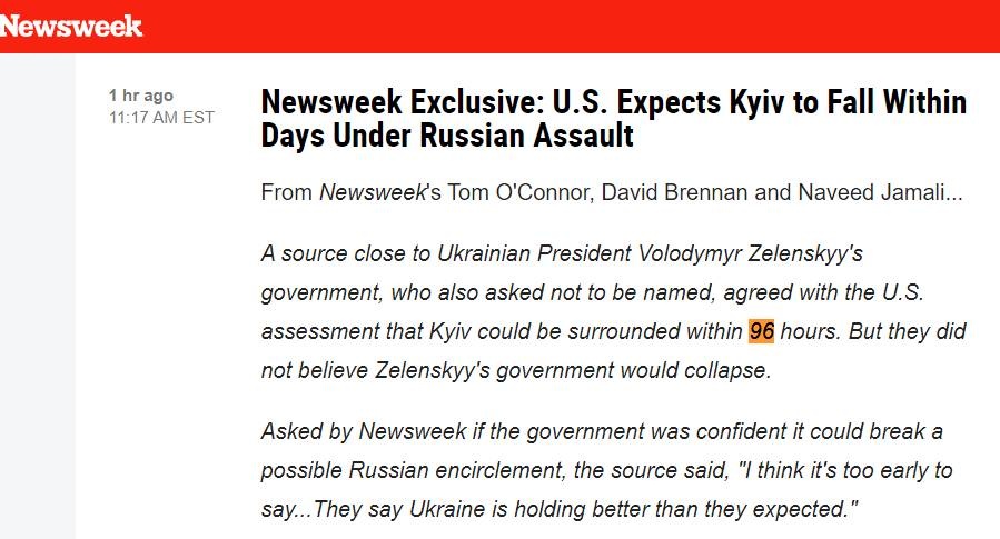 Αναμένουν ότι το Κίεβο θα καταληφθεί εντός 96 ωρών και στη συνέχεια, σε περίπου μια εβδομάδα, θα καταληφθεί και η ηγεσία της Ουκρανίας.