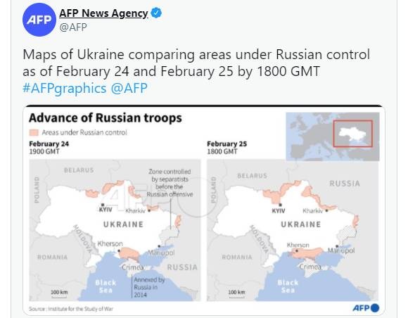 «Η ταχύτητα της ρωσικής προέλασης έχει προσωρινά επιβραδυνθεί πιθανόν ως αποτέλεσμα οξέων υλικοτεχνικών προβλημάτων και της σθεναρής ουκρανικής αντίστασης», λέει το βρετανικό υπουργείο Άμυνας, σε ένα επικαιροποιημένο tweet, έπειτα από αναφορές των υπηρεσιών πληροφοριών.