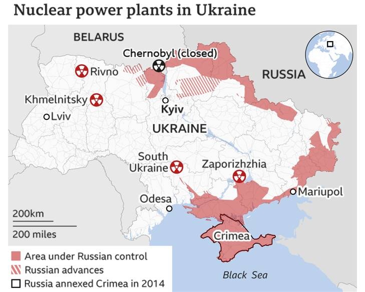 Υπάρχουν τέσσερις μεγάλοι πυρηνικοί σταθμοί στην Ουκρανία και το Τσερνομπίλ που δεν λειτουργεί. Η Ρωσία ελέγχει τη Ζαπορίζια και το Τσερνόμπιλ και πλησιάζει σε μια τρίτη τοποθεσία - τον πυρηνικό σταθμό της Νότιας Ουκρανίας.