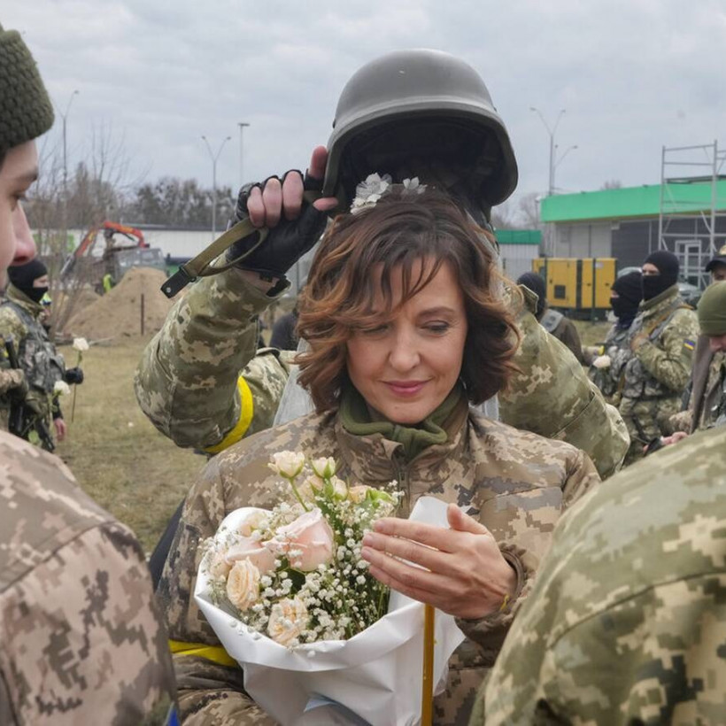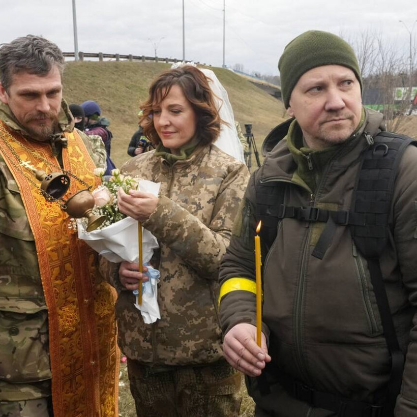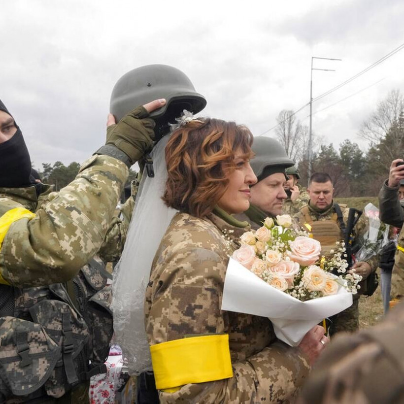 Εν μέσω μαχών, ένα ζευγάρι που ανήκει στις Ουκρανικές Δυνάμεις Εδαφικής Άμυνας, η Λέσια Ιβατσέκνο και ο Βαλερί Φιλιμόνοφ, παντρεύτηκαν σε ένα σημείο ελέγχου στο Κίεβο.