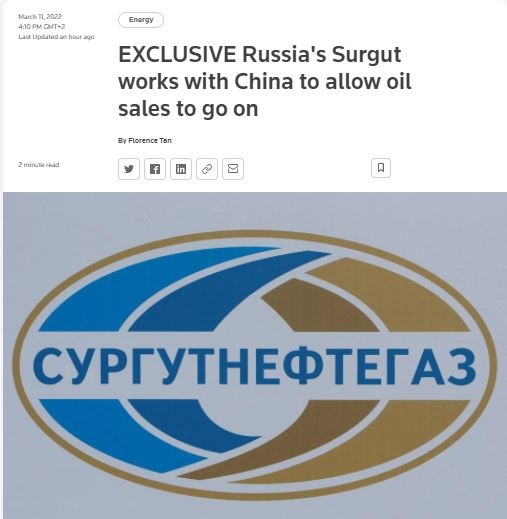 Πόλεμος στην Ουκρανία: Η ρωσική πετρελαϊκή εταιρεία Surgutneftegas (SNGS.MM) επέτρεψε – σύμφωνα με το Reuters - στους Κινέζους αγοραστές να λαμβάνουν πετρέλαιο χωρίς να παρέχουν εγγυήσεις γνωστές ως πιστωτικές επιστολές (LC) προκειμένου να παρακάμψουν τις δυτικές κυρώσεις.