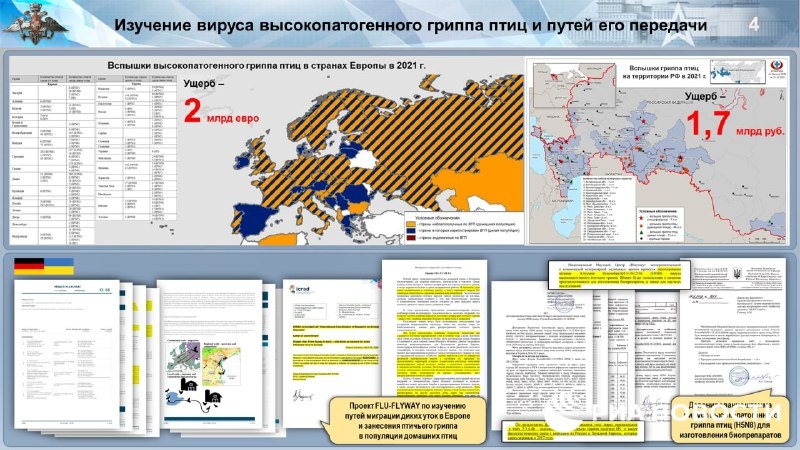 Σύμφωνα με τον επικεφαλής της ρωσικής υπηρεσίας προστασίας από ραδιολογικές, χημικές και βιολογικές απειλές, Igor Kirillov, στελέχη αυτών των βιολογικών όπλων δημιουργήθηκαν στην Ουκρανία», αποκαλύπτοντας έγγραφο-με ημερομηνία 6 Μαρίου του 2015- το οποίο επιβεβαιώνει την άμεση εμπλοκή του Πενταγώνου.