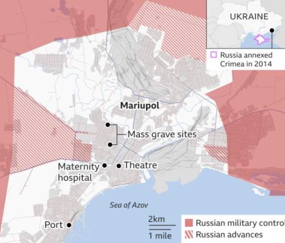 Χαρακτηριστικός της κατάστασης είναι ο χάρτης που δημοσίευσε το BBC και δείχνει τις ρωσικές δυνάμεις να έχουν περικυκλώσει την Μαριούπολη: