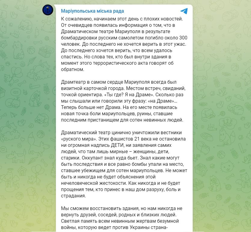 «Δυστυχώς, ξεκινάμε αυτή τη μέρα με άσχημα νέα. Πληροφορίες από αυτόπτες μάρτυρες αναφέρουν ότι περίπου 300 άνθρωποι έχασαν τη ζωή τους στο Θέατρο της Μαριούπολης ως αποτέλεσμα βομβαρδισμού από ρωσικό αεροσκάφος. Μέχρι το τελευταίο λεπτό, δεν θέλαμε να πιστέψουμε αυτή τη φρίκη. Θέλουμε να πιστεύουμε ότι όλοι κατάφεραν να ξεφύγουν.