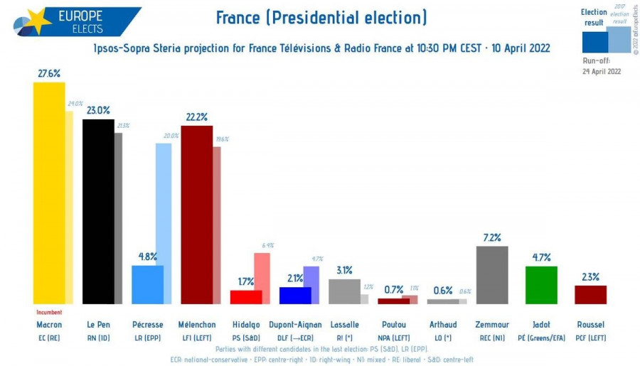 Παρ’ όλ’ αυτά, με βάση τα καταμετρημένα ψηφοδέλτια στο σύνολο της γαλλικής επικράτειας, αλλά και τις εκτιμήσεις των ινστιτούτων δημοσκοπήσεων, η Μαρίν Λεπέν είναι αυτή που θα περάσει στον δεύτερο γύρο και θα αναμετρηθεί με τον απερχόμενο πρόεδρο Εμανουέλ Μακρόν.