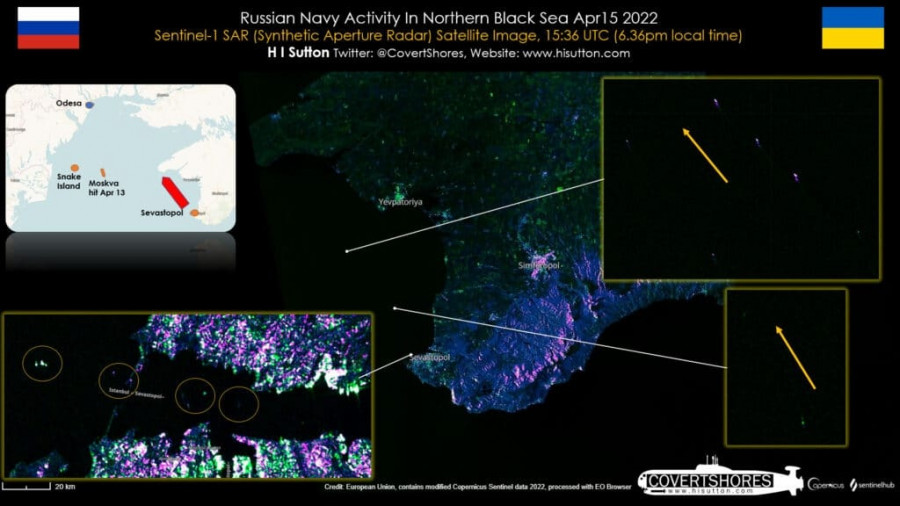 Οι δορυφορικές εικόνες από το ραντάρ της βόρειας Μαύρης Θάλασσας, στις 13 Απριλίου, φαίνεται να εντοπίζουν το πολεμικό πλοίο Moskva, το οποίο η Ουκρανία υποστήριξε ότι χτυπήθηκε από δύο πυραύλους κρουζ Neptune, που εκτοξεύτηκαν από σιλό κοντά στο λιμάνι της Οδησσού. Άλλα σκάφη φαίνονται επίσης να βρίσκονται, πιθανότατα είναι τα πλοία διάσωσης, σύμφωνα με το Naval News.