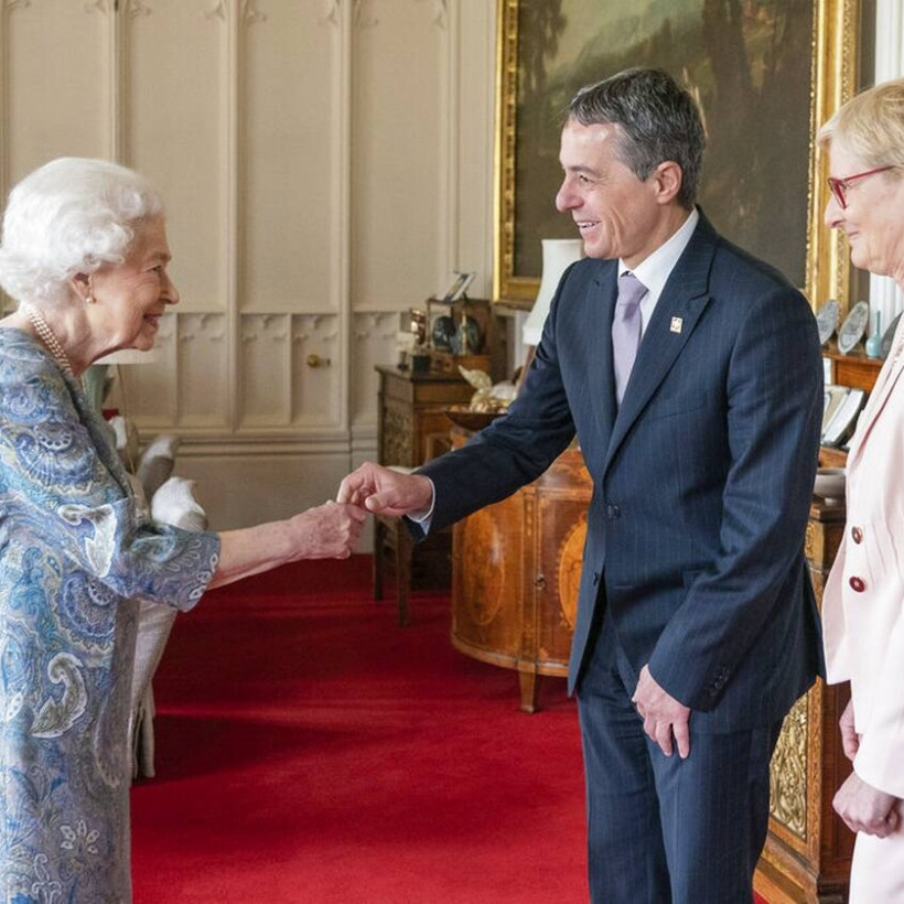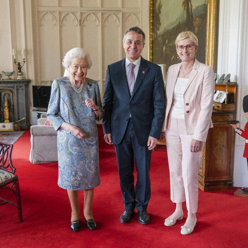 Η μονάρχης, η οποία αντιμετώπισε προβλήματα κινητικότητας τους τελευταίους μήνες, φωτογραφήθηκε χαμογελαστή με τον Ignazio Cassis και την σύζυγό του Paola στο καθιστικό της στο Oak Room το πρωί της Πέμπτης (28/4).