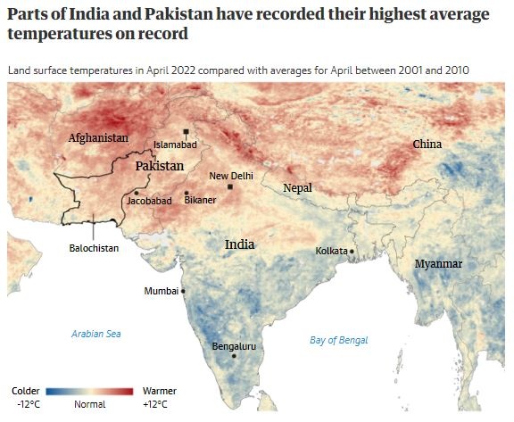 Η βορειοδυτική και η κεντρική Ινδία γνώρισαν τον πιο ζεστό Απρίλιο των τελευταίων 122 ετών, ενώ το Τζακομπαμπάντ, μια πόλη στην επαρχία Σιντ του Πακιστάν, έφτασε τους 49 βαθμούς Κελσίου το Σάββατο, μια από τις υψηλότερες θερμοκρασίες του Απριλίου που έχουν καταγραφεί ποτέ στον κόσμο.