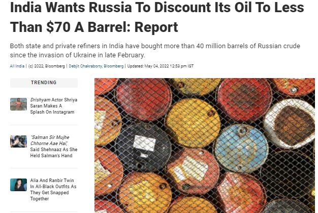 Σύμφωνα με το Bloomberg η Ινδία προσπαθεί να επιτύχει ακόμα μεγαλύτερη έκπτωση από εκείνη των 35 δολ./βαρέλι που προσφέρει η Ρωσία, επικαλούμενη «αύξηση του ρίσκου» μετά τις κυρώσεις που επιβάλλει η Δύση λόγω του πολέμου στην Ουκρανία.
