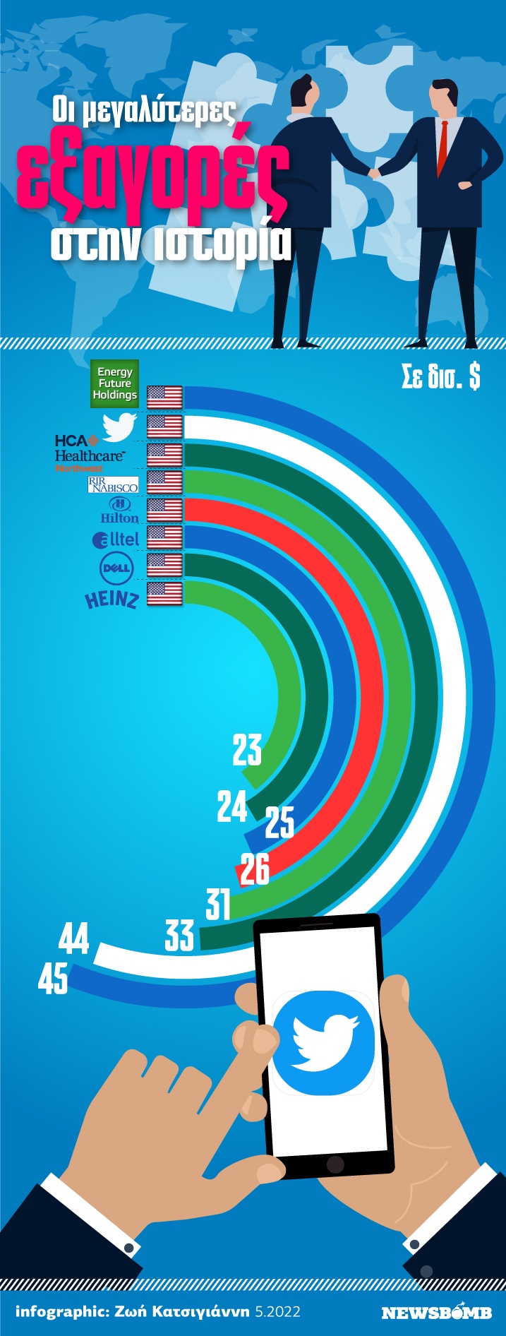H συμφωνία εξαγοράς του Twitter από τον Έλον Μασκ προκάλεσε αναταράξεις στην παγκόσμια οικονομία. Το «deal» δεν έχει οριστικοποιηθεί μπήκε ωστόσο ήδη στη λίστα με τις μεγαλύτερες εξαγορές παγκοσμίως, όπως δείχνει το Infographic του Νewsbomb.gr