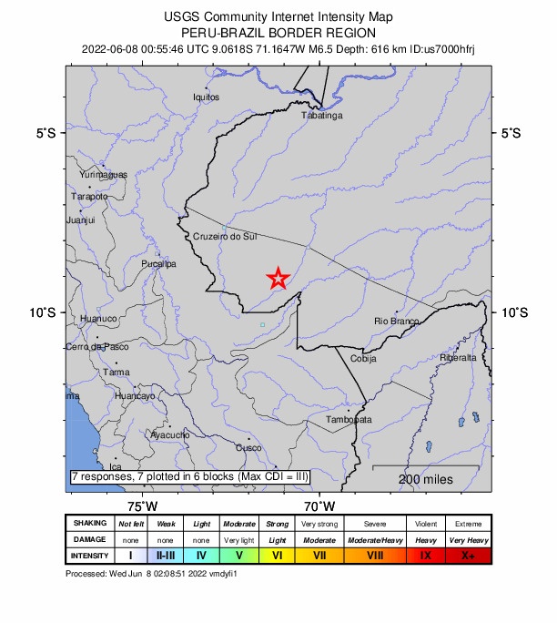 Ισχυρή σεισμική δόνηση 6,5 μεγέθους βαθμών σημειώθηκε την Τρίτη (03:55 ώρα Ελλάδος) σε περιοχή των συνόρων του Περού και της Βραζιλίας, σύμφωνα με το Ευρωμεσογειακό Σεισμολογικό Κέντρο (EMSC).