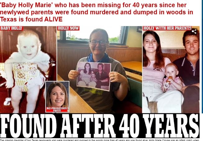 Σύμφωνα με όσα μεταδίδει η Daily Mail η «Χόλι Μαίρη Κλούζ» ήταν βρέφος όταν οι γονείς της, Χάρολντ και Τίνα Κλουζ εξαφανίστηκαν στα τέλη του 1980 ενώ μετακόμισαν από τη Φλόριντα στο Τέξας.