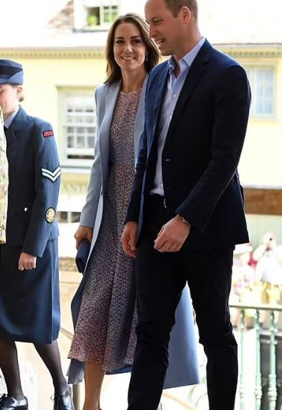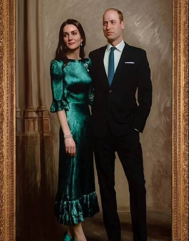 Ποζάρει με το χέρι της τυλιγμένο γύρω από τον πρίγκιπα Ουίλιαμ, ο οποίος φοράει ένα κομψό κοστούμι με μπλε γραβάτα. Ζωγραφισμένο από τον βραβευμένο Βρετανό καλλιτέχνη πορτραίτων Jamie Coreth, το έργο παραγγέλθηκε το 2021 από το Cambridgeshire Royal Portrait Fund, το οποίο κατέχει το Cambridge Community Foundation, ως δώρο στο Μουσείο.