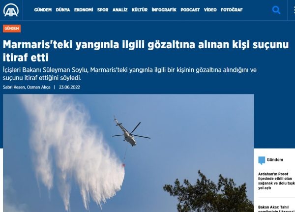 Όπως υποστήριξε σε δηλώσεις του στα τουρκικά ΜΜΕ, «η συνεργασία της Ελλάδας με την τρομοκρατία, που αποτυπώνεται ακόμη και στη ρητορική των Ελλήνων βουλευτών, εμφανίζεται στα δάση μας το καλοκαίρι του 2022. Είναι σημαντικό να επαγρυπνούμε απέναντι σε αυτή τη σκοτεινή συμμαχία, η οποία καταβάλλει μεγάλες προσπάθειες για να ωθήσει την Τουρκία στο χάος, την αναταραχή και τη σύγχυση».