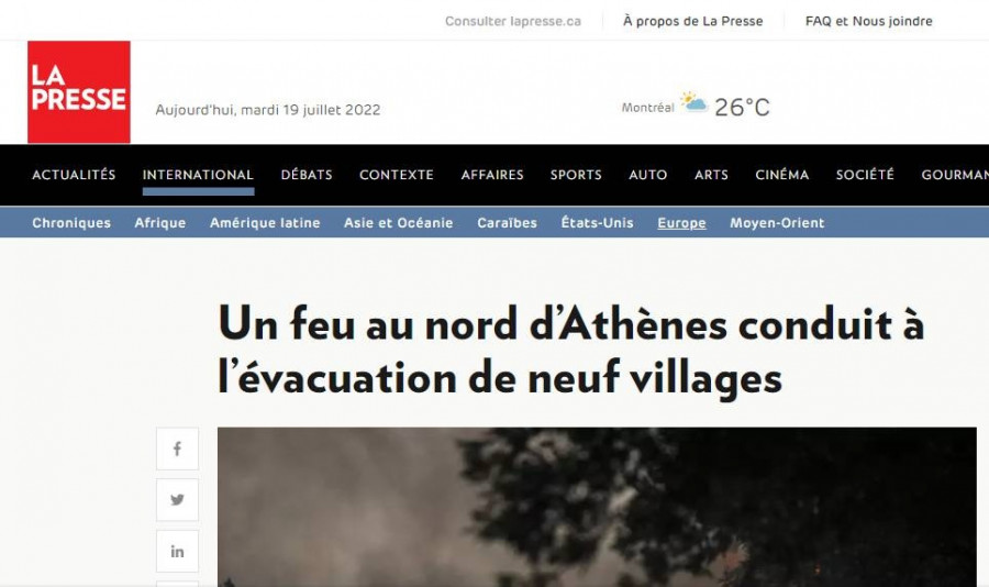 La Presse: Φωτιά στο βορρά της Αθήνας οδηγεί στην εκκένωση 9 οικισμών, γράφει η γαλλόφωνη ψηφιακή εφημερίδα του Καναδά.