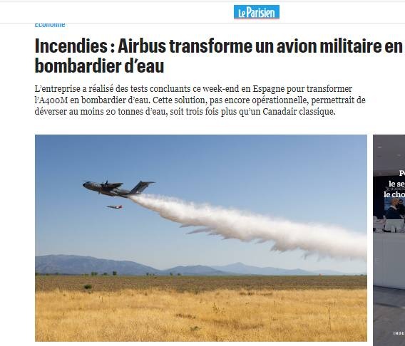 Ψάχνοντας λύση για την θωράκιση της χώρα - όπως μεταδίδει η Parisien - «η Airbus πραγματοποίησε δοκιμές την περασμένη εβδομάδα για να επικυρώσει την εγκατάσταση ενός ειδικού κιτ στο στρατιωτικό της αεροπλάνο A400M που του επιτρέπει να μεταμορφωθεί σε πυροσβεστικό για την καταπολέμηση των πυρκαγιών. Η εταιρεία έχει ακόμη να πραγματοποιήσει αρκετές δοκιμές, αλλά ελπίζει ότι θα είναι σε θέση να προσφέρει αυτήν την εναλλακτική λύση σε ενδιαφερόμενες χώρες, αφού στα συγκεκριμένα αεροπλάνα η χωρητικότητα νερού είναι τουλάχιστον τρεις φορές μεγαλύτερη από ό,τι σε ένα κλασικό Canadair».