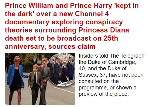 Ένα νέο ντοκιμαντέρ αναμένεται να ρίξει φως στις συνθήκες του τροχαίου δυστυχήματος, πριν από 25 χρόνια, κάτω από τις οποίες έχασε τη ζωή της η πριγκίπισσα Νταϊάνα - Στο... σκοτάδι ο πρίγκιπας Ουίλιαμ και ο Χάρι για το περιεχόμενό του