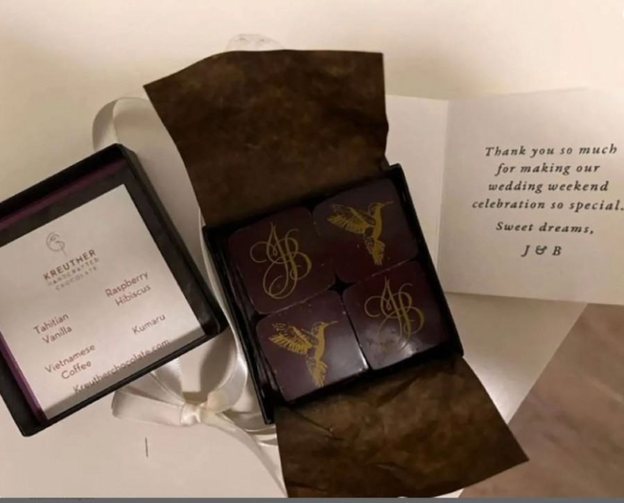 Ένα σημείωμα μαζί με τις σοκολάτες έγραφε: «Σας ευχαριστούμε πολύ που κάνατε τη γιορτή του Σαββατοκύριακου του γάμου μας τόσο ξεχωριστή. Όνειρα γλυκά, J & B.» Οι γλυκές γεύσεις στο καφέ κουτί, το οποίο ήταν διακοσμημένο με τα αρχικά του ζευγαριού, περιελάμβαναν ιβίσκο βατόμουρου, βανίλια Ταϊτής και βιετναμέζικο καφέ.