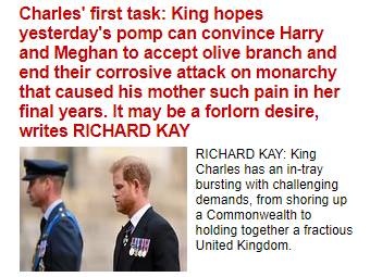 Όπως σχολιάζει ο δημοσιογράφος της εφημερίδας «Daily Mail», Ρίτσαρντ Κέι, ο βασιλιάς Κάρολος ευελπιστεί ότι ο χαμός της μητέρας του θα λυγίσει τον Χάρι και τη σύζυγό του Μέγκαν Μαρκλ έτσι ώστε να βάλουν τέλος στις επιθετικές συνεντεύξεις που έχουν φέρει σε δεινή θέση τα Ανάκτορα του Μπάκιγχαμ.