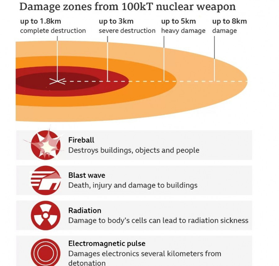 Αλλά ακόμη και η πιο μικρή κεφαλή θα μπορούσε να προκαλέσει τεράστιες απώλειες ζωών και μόνιμες συνέπειες. Η βόμβα που σκότωσε έως και 146.000 ανθρώπους στη Χιροσίμα της Ιαπωνίας, κατά τη διάρκεια του Β' Παγκοσμίου Πολέμου, ήταν 15 κιλοτόνων. Και οι πυρηνικές κεφαλές σήμερα μπορεί να είναι πάνω από 1.000 κιλοτόνους.