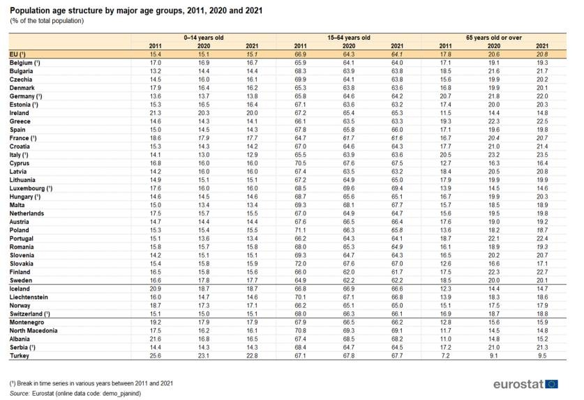 Μετά την Φινλανδία, η Ελλάδα έχει το μεγαλύτερο ποσοστό κατοίκων ηλικίας 65 ετών και άνω από όλα τα κράτη- μέλη της ΕΕ. Τα τελευταία δέκα χρόνια – από το 2011 ως το 2021 – το ποσοστό των ανθρώπων άνω των 65 στην Ελλάδα έχει παρουσιάσει αύξηση από το 19,3% στο 22,5%.