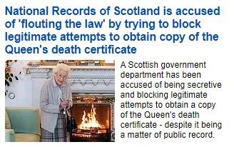 Ειδικότερα «ένα τμήμα της κυβέρνησης της Σκωτίας κατηγορήθηκε ότι εμποδίζει τις νόμιμες προσπάθειες απόκτησης αντιγράφου του πιστοποιητικού θανάτου της βασίλισσας - παρά το γεγονός ότι πρόκειται για δημόσιο αρχείο.