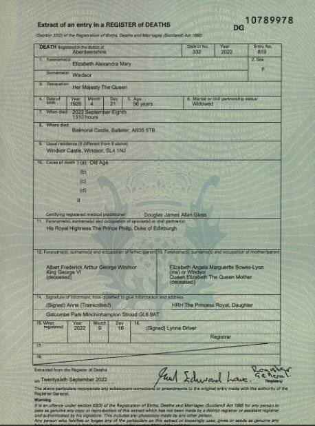 Τα παραπάνω αναφέρει το πιστοποιητικό θανάτου της Βασίλισσας Ελισάβετ, που κυκλοφόρησε από την National Records of Scotland, ενώ κάνει γνωστό ότι πέθανε από «γήρας». Αυτή που έκανε γνωστό τον θάνατό - σύμφωνα με την ληξιαρχική πράξη θανάτου - ήταν η κόρη της πριγκίπισσα Άννα.