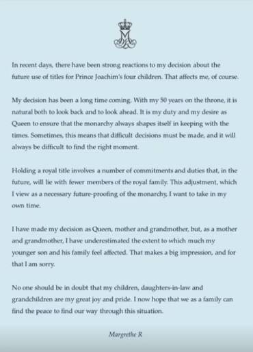 Η δήλωση ανέφερε: «Τις τελευταίες ημέρες υπήρξαν έντονες αντιδράσεις στην απόφασή μου σχετικά με τη μελλοντική χρήση τίτλων για τα τέσσερα παιδιά του πρίγκιπα Ιωακείμ η οποία προφανώς με επηρεάζει.