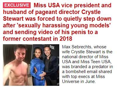 Ο Μαξ Σέμπρεχτς, του οποίου η σύζυγος Κρίσλ Στιούαρτ είναι η πανίσχυρη εθνική διευθυντής των Miss USA και Miss Teen USA, παραιτήθηκε από τη θέση του αφού μια από τις διαγωνιζόμενες του 2021 παραπονέθηκε ότι εισέβαλε στον δωμάτιο της και τη φίλησε.