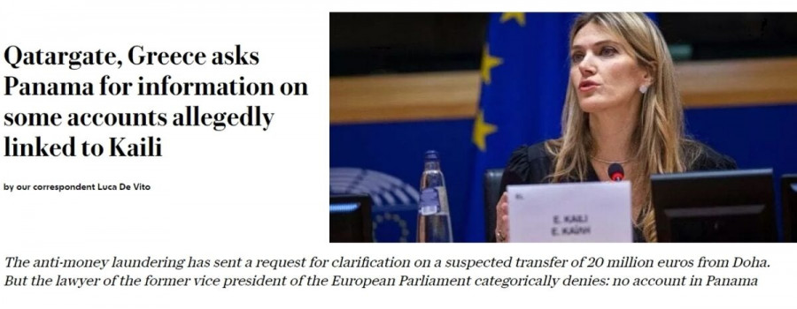 Πλέον, οι ελληνικές Αρχές μέσω της Αρχής Καταπολέμησης του Ξεπλύματος Χρήματος έχουν βάλει στο «μικροσκόπιο» όλες τις μεταφορές χρημάτων από το Κατάρ σε λογαριασμούς που ανήκουν στην ευρωβουλευτή του ΠΑΣΟΚ Εύα Καϊλή και τον σύζυγο της Φραντσέσκο Τζόρτζι σημειώνει η ιταλική εφημερίδα αναφερόμενη στο επίσημο αίτημα του αντιεισαγγελέα του Αρείου Πάγου και Προέδρου της Αρχής Καταπολέμησης της Νομιμοποίησης Εσόδων από Εγκληματικές Δραστηριότητες, Χαράλαμπου Βουρλιώτη, προς τις αρχές του Παναμά μετά τις αναφορές για εμβάσματα 20 εκατομμύριων ευρώ.