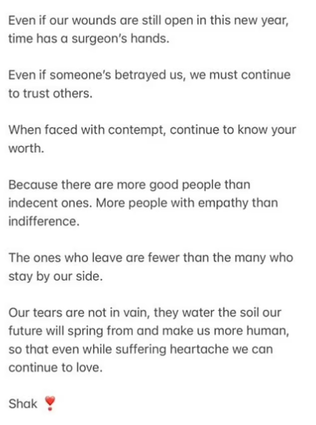 Η Σακίρα φάνηκε να «χτυπά» τον πρώην της με μια πρωτοχρονιάτικη ανάρτηση σχετικά με την προδοσία και τον πόνο, λέγοντας σε ένα μήνυμα στο Instagram: «Αν και οι πληγές μας παραμένουν ανοιχτές αυτή τη νέα χρονιά, ο χρόνος έχει χέρια χειρουργού. Αν κάποιος μας πρόδωσε, θα πρέπει να συνεχίσουμε να εμπιστευόμαστε. Αντιμέτωποι με την περιφρόνηση, να συνεχίσουμε να εκτιμάμε τον εαυτό μας.