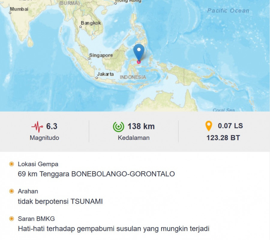 Η ινδονησιακή υπηρεσία μετεωρολογίας, κλιματολογίας και γεωφυσικής (BMKG) έκανε επίσης λόγο για σεισμό 6,3 Ρίχτερ, ενώ διευκρίνισε πως δεν υπάρχει κίνδυνος να προκληθεί τσουνάμι.