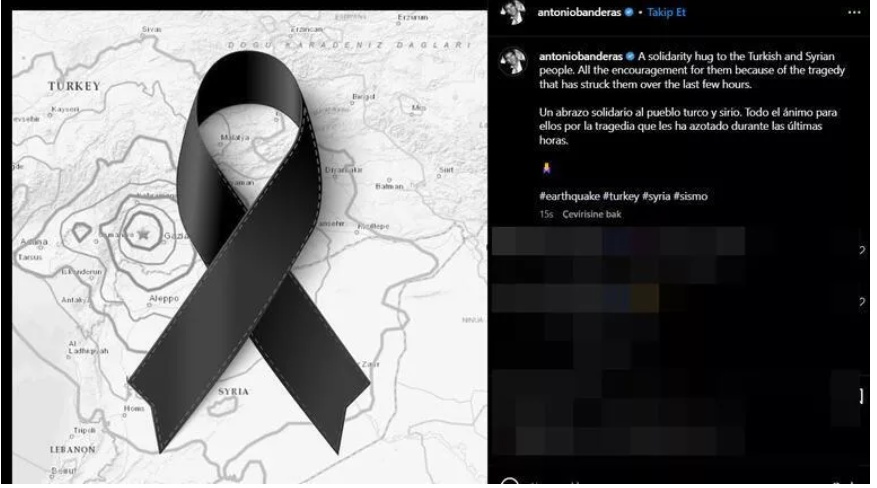 Ο Αντόνιο Μπαντέρας αναφέρθηκε απο την πρώτη στιγμή στο δράμα των σεισμόπληκτων, εκφράζοντας τη συμπαράστασή του. «Αγκαλιάζω τον λαό της Τουρκίας και της Συρίας. Τις τελευταίες ώρες έζησαν μια απερίγραπτη τραγωδία. Εύχομαι σε όλους κουράγιο."