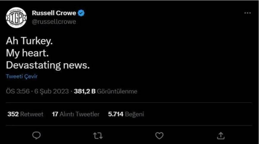 Ο Ράσελ Κρόου έκανε λόγο για τρομερά, αποκαρδιωτικά νέα. «Ω Τουρκία. Καρδιά μου. Τα νέα είναι τρομερά.» Ο Ευγκένι Γκρίνγκο σχολίασε: «Λυπάμαι πολύ για τον σεισμό που σημειώθηκε στο Kahramanmaraş και επηρέασε επίσης τις γύρω επαρχίες. Εκφράζω τα συλλυπητήριά μου σε όσους έχασαν τη ζωή τους και ταχεία ανάρρωση στους τραυματίες. Η καρδιά μου είναι μαζί σας.»