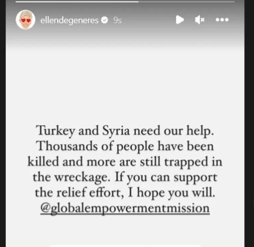 Η Έλεν Ντε Τζένερις, μοιράστηκε στον λογαριασμό της στο Instagram ότι χιλιάδες άνθρωποι έχασαν τη ζωή τους στην Τουρκία και τη Συρία λόγω του σεισμού και ότι χιλιάδες από αυτούς περιμένουν να σωθούν κάτω από τα ερείπια. Κοινοποίησε επίσης τον σύνδεσμο των τοποθεσιών όπου μπορεί να παρασχεθεί διεθνής βοήθεια σε θύματα σεισμών.