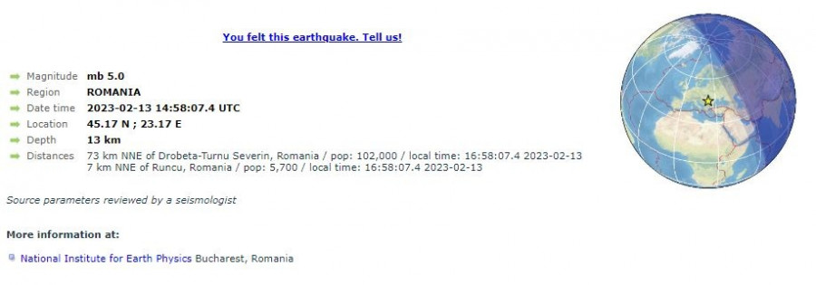 Σύμφωνα με το εθνικό ινστιτούτο γεωλογίας της Ρουμανίας ο σεισμός έλαβε χώρα στις 16:58:06 (τοπική ώρα) στην επαρχία Ολτένια, μεγέθους 5 βαθμών και σε βάθος 13 χιλιομέτρων.
