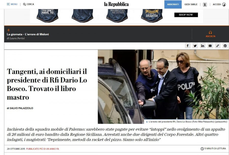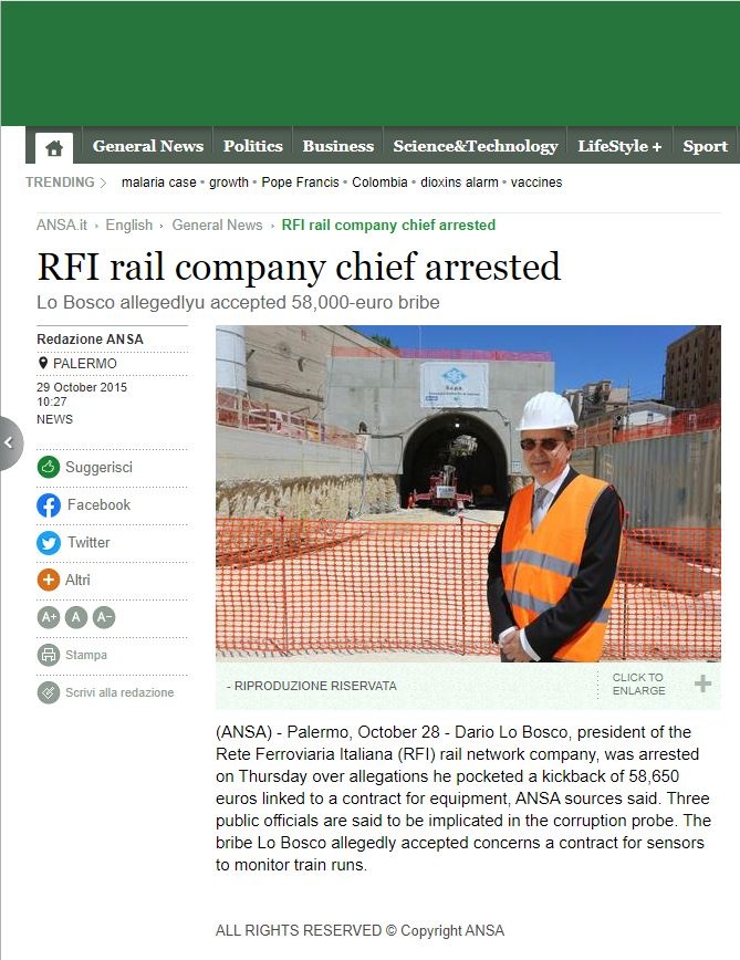 «Εκτός από τα τρία άτομα που κατέληξαν σε κατ' οίκον περιορισμό για δωροδοκία για δημόσιο διαγωνισμό και για αγορά ενός πρωτοτύπου που υποτίθεται ότι χρησιμοποιούσε το Rfi, ο εισαγγελέας έχει εγγράψει στο μητρώο υπόπτων και άλλους. Ο Λο Μπόσκο, καθηγητής πανεπιστημίου με καταγωγή από το Raffadali της Σικελίας, είναι επίσης πρόεδρος της εταιρείας μεταφορών της Σικελίας. Τις τελευταίες μέρες είχε βρεθεί στο προσκήνιο για την υπόθεση αυτή, αλλά είχε υπερασπιστεί τον εαυτό του.