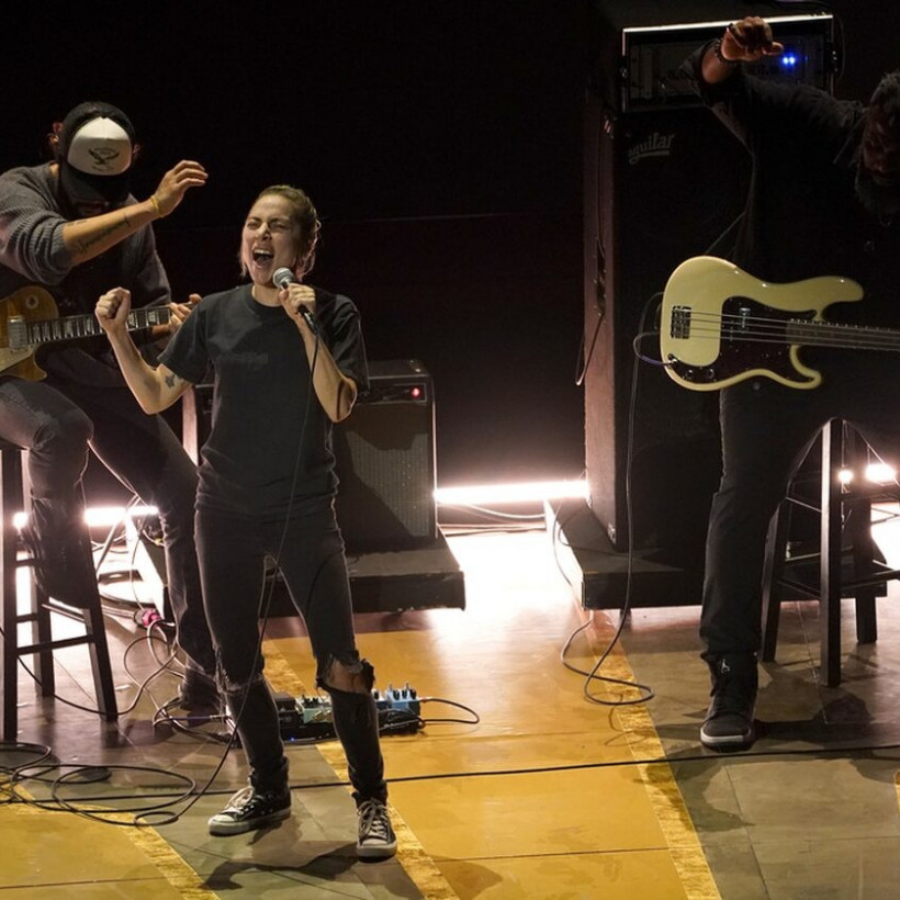 Ντυμένη στα μαύρα, με ένα T-shirt, σκισμένο τζιν, αθλητικά παπούτσια και σχεδόν αμακιγιάριστη ερμήνευσε το τραγούδι «Hold My Hand» από την ταινία «Top Gun: Maverick». Οπως αναφέρει το Variety ήταν αφιερωμένο στον σκηνοθέτη Τόνι Σκοτ.
