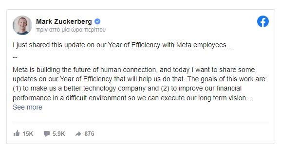 «Συνολικά, αναμένουμε να μειώσουμε το μέγεθος της ομάδας μας κατά περίπου 10.000 άτομα και να κλείσουμε περίπου 5.000 επιπλέον ανοιχτούς ρόλους που δεν έχουμε προσλάβει ακόμη. Θα είναι δύσκολο και δεν υπάρχει τρόπος να το αποφύγουμε. Αυτό σημαίνει πως πρέπει να πούμε αντίο σε ταλαντούχους και παθιασμένους συναδέλφους που ήταν μέρος της επιτυχίας μας», είπεο Μαρκ Ζούκερμπεργκ.