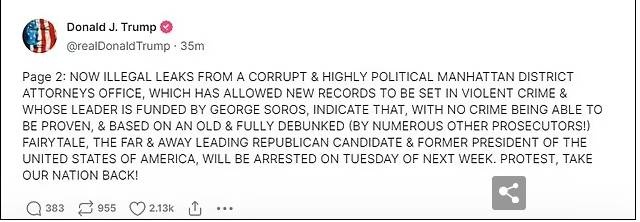 Ο Τραμπ υποστήριξε στον λογαριασμό του στο Truth Social ότι το γραφείο του εισαγγελέα του Μανχάταν θα τον συλλάβει την Τρίτη για τις κατηγορίες. Τους χαρακτήρισε «διεφθαρμένους και άκρως πολιτικοποιμένους», αποκαλώντας την υποτιθέμενη πληρωμή χρημάτων «παλιό και πλήρως απομυθοποιημένο παραμύθι».